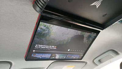 Ich hatte immer wieder überlegt, Monitore in die Kopfstützen einzubauen, doch dazu kam es nie. Stattdessen entschied ich mich für einen Deckenmonitor mit Android. Verbaut ist ein Full-HD-Display, das auch 4K-Inhalte abspielen kann. Ich habe es mit dem MMCS verbunden, sodass DVDs wiedergegeben werden können.