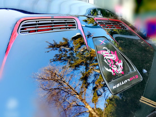 2014 entschied ich mich, die OEM-Alu-Motorhaube vom Evo zu kaufen. Ich bestellte sie direkt bei Mitsubishi (1100,- € unlackiert und ohne Zubehör) und ließ sie in meiner Wagenfarbe lackieren. Die Lufthutzen wählte ich aus Echtcarbon von Seibon Carbon, und auf der mittleren Lufthutze platzierte ich mein selbst entworfenes Logo.